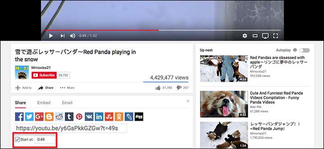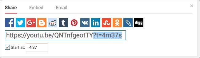 Klicken Sie darauf und Sie sehen das Freigabefeld. Es gibt die übliche große Auswahl an Social-Media-Schaltflächen, aber auch ein Kontrollkästchen neben den Worten "Start um".