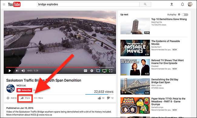 Beginnen wir auf dem Desktop. Unter dem Videotitel und der Schaltfläche "Abonnieren" für den Kanal wird eine Schaltfläche "Teilen" angezeigt.