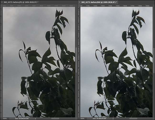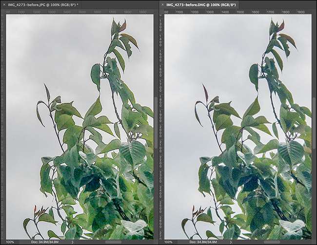 Obwohl Sie ein Foto nie wirklich so weit verschieben möchten, können Sie sehen, dass die Textur in den Blättern in der RAW-Datei immer noch in Ordnung aussieht, während sie im JPG zu Mush geworden sind. Es gibt auch ein etwas subtileres Blau am Himmel.