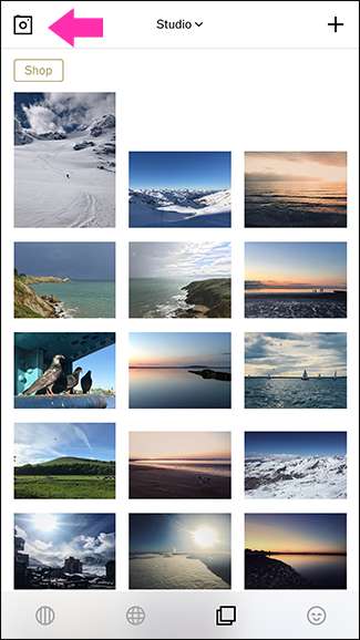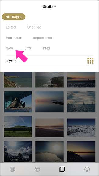 Eine praktische Funktion von VSCO ist, dass es wirklich einfach ist, von Ihnen aufgenommene RAW-Fotos zu sehen. Tippen Sie im Hauptbildschirm auf das Dropdown-Menü „Studio“ und wählen Sie dann die Option „RAW“.