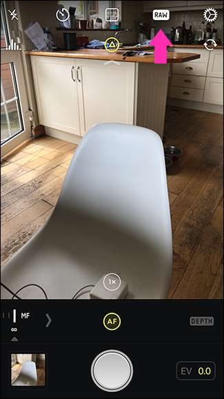 Standardmäßig erfasst Halide RAW-Dateien. Wenn Sie sie ausschalten möchten, ziehen Sie sie vom oberen Bildschirmrand nach unten und tippen Sie anschließend auf die Option „RAW“. Wenn es gelb ist, erfassen Sie RAW-Dateien. Wenn es weiß ist, nehmen Sie JPGs auf.