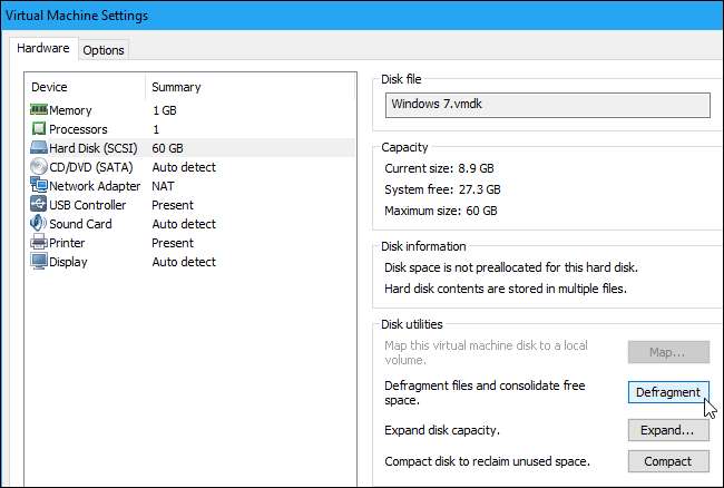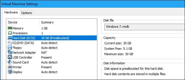 Ihre virtuelle Maschine hat aber wahrscheinlich eine erweiterbare Festplatte. VMware Player kann nur erweiterbare Datenträger erstellen, VMware Fusion verwendet immer erweiterbare Datenträger, es sei denn, Sie weisen den Speicherplatz in den Einstellungen einer virtuellen Maschine nach dem Erstellen zu, und VMware Workstation erstellt erweiterbare Datenträger, sofern Sie nicht in die benutzerdefinierten Einstellungen gehen und "Jetzt den gesamten Speicherplatz zuweisen" aktivieren ”Beim Erstellen einer neuen virtuellen Maschine.