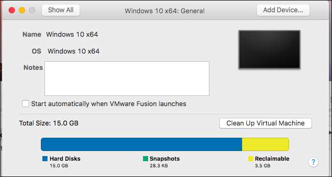 Mit VMware Fusion können Sie auch Snapshots erstellen, die den Status einer virtuellen Maschine zu einem bestimmten Zeitpunkt erfassen. Wenn diese gemäß den hier angegebenen Informationen zur Festplattennutzung viel Speicherplatz belegen, können Sie Snapshots löschen, um Speicherplatz freizugeben, wenn Sie sie nicht mehr benötigen.