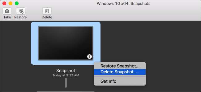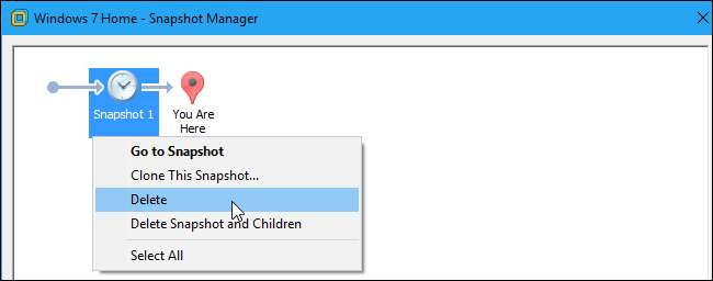 Um einen nicht mehr benötigten Snapshot zu löschen, klicken Sie im Snapshot Manager-Fenster mit der rechten Maustaste darauf und wählen Sie "Löschen". Es wird von Ihrem Computer entfernt.