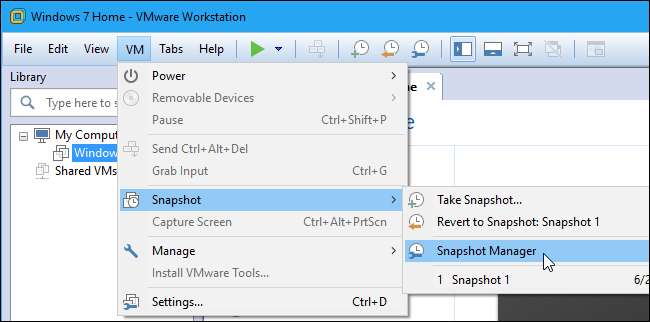 Um die Snapshots für eine virtuelle Maschine anzuzeigen, wählen Sie die virtuelle Maschine in VMware Workstation aus und klicken Sie auf VM> Snapshot> Snapshot Manager.