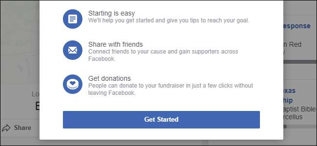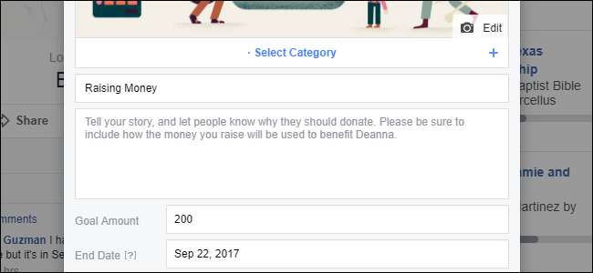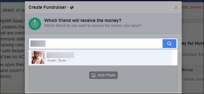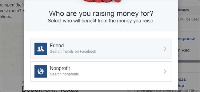 Facebook fragt, ob Sie Geld für einen Freund oder eine gemeinnützige Organisation sammeln. In diesem Beispiel wählen wir "Freund".