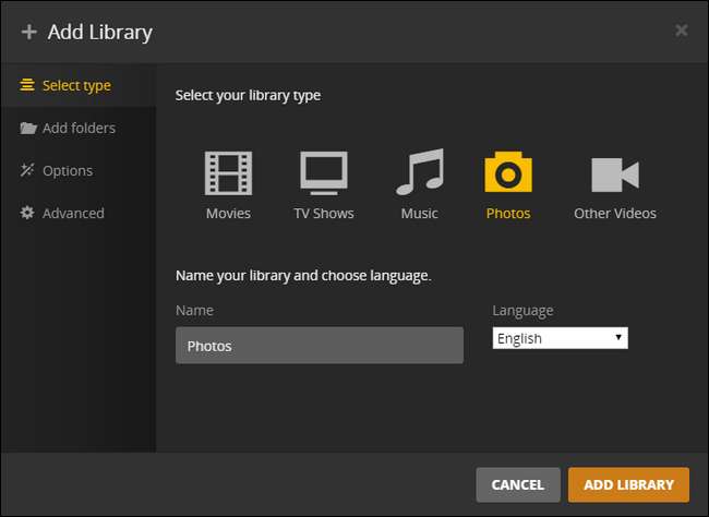 Der erste Schritt des Prozesses besteht darin, Ihren Bibliothekstyp auszuwählen, ihn zu benennen und eine Sprache auszuwählen. Wählen Sie "Fotos", nennen Sie es "Fotos" (oder, wenn Sie mehrere Bibliotheken erstellen möchten, einen aussagekräftigeren Namen wie "Familienfotos") und stellen Sie die Sprache auf Ihre Primärsprache ein. (Wenn Sie die Plex Pass-Fototagging-Funktion nutzen, werden die Tags in der Sprache hinzugefügt, auf die die Bibliothek eingestellt ist.)