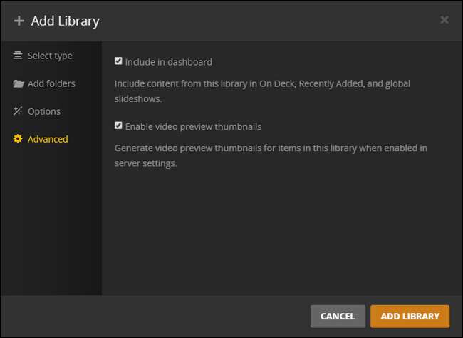 Schließlich werden Sie in der Option "Erweitert" gefragt, ob Ihre Fotobibliothek im Haupt-Dashboard Ihres Plex-Servers enthalten sein soll und ob Sie Video-Miniaturansichten wünschen. Die erste Option fügt einfach neue Fotos auf die Hauptseite Ihrer Plex-Oberfläche ein, genau wie neue TV-Shows und Filme (und wenn der ganze Grund, warum Sie diese Plex-Bibliothek verwenden, darin besteht, dass Familienmitglieder neue Fotos durchsuchen können, dann ist dies der Fall macht Sinn, dies zu überprüfen). Die zweite Option aktiviert die Vorschau aller Heimvideos, die auch in Ihrer Fotobibliothek angezeigt werden.