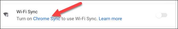 Nächstes suchen Sie nach "Wi-Fi Sync". Der Kippknopf wird wahrscheinlich ausgegraut (wie unten gezeigt). Klicken Sie auf den Link "Chrome Sync", um zu den Einstellungen zu gelangen.