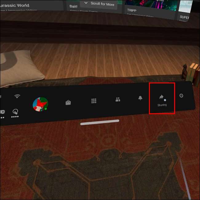 Beginnen Sie mit dem Öffnen des Systemmenüs durch Drücken der Oculus-Taste auf dem rechten Berührungscontroller. Wählen Sie von der unteren Taskleiste die Registerkarte "Freigabe" aus.