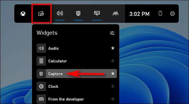 Wenn Sie das Fenster "Capture" auf dem Bildschirm Xbox-Game-BAR nicht nicht sehen, klicken Sie in der Symbolleiste oben auf dem Bildschirm auf die Schaltfläche "Widgets" in der Symbolleiste und wählen Sie "Capture".