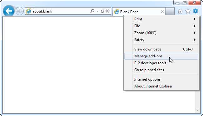 Wenn das Ausführen von Internet Explorer ohne Browser-Add-Ons Ihr Problem behoben hat, können Sie die Add-Ons einzeln deaktivieren, um das Problem zu identifizieren. Klicken Sie auf das Zahnradmenü und wählen Sie Add-Ons verwalten, um das Fenster Add-Ons verwalten zu öffnen.