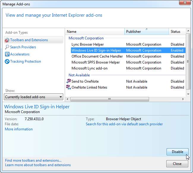 Wählen Sie ein Add-On in der Kategorie Symbolleisten und Erweiterungen aus und klicken Sie auf die Schaltfläche Deaktivieren, um es zu deaktivieren. Deaktivieren Sie Add-Ons nacheinander - oder deaktivieren Sie sie alle und aktivieren Sie sie nacheinander -, bis Sie das Add-On identifiziert haben, das das Problem verursacht.