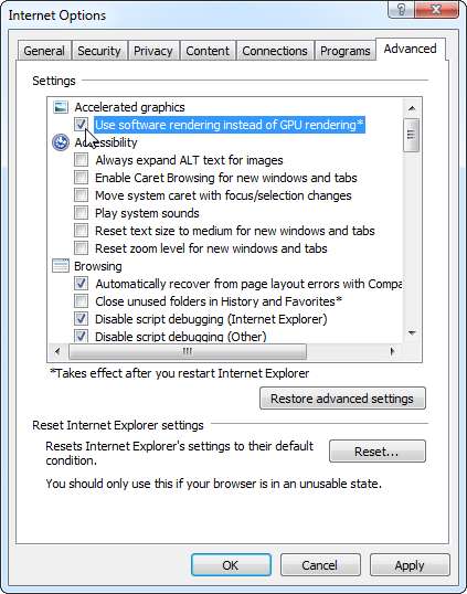 Klicken Sie auf die Registerkarte Erweitert und aktivieren Sie die Option "Software-Rendering anstelle von GPU-Rendering verwenden" unter "Beschleunigte Grafiken". Sie müssen den IE neu starten, nachdem Sie diese Einstellung geändert haben.