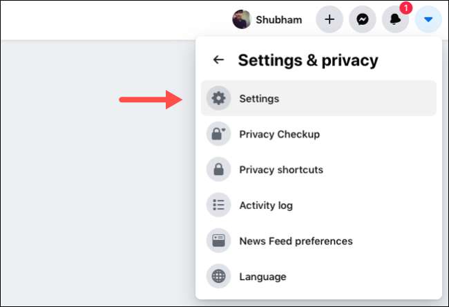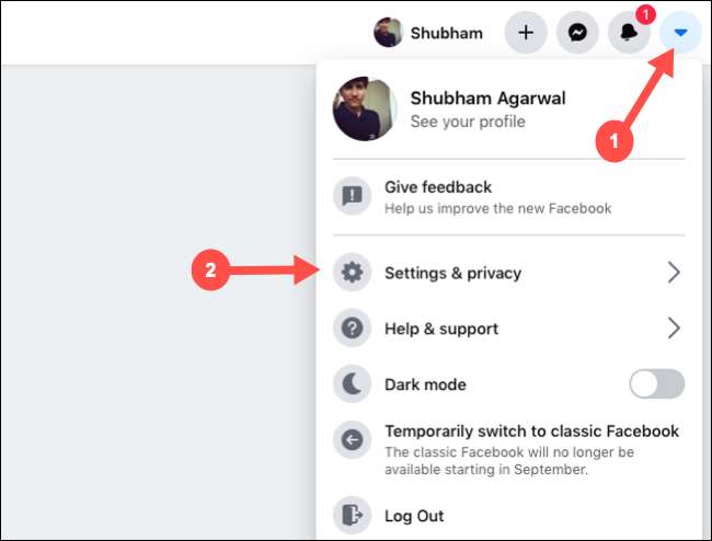 Klicken Sie in der oberen rechten Ecke auf das Abwärtspfeil-Symbol und wählen Sie "Einstellungen & AMP; Datenschutz "aus dem Dropdown-Menü.