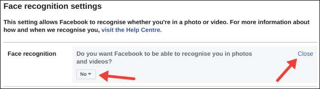 Wechseln Sie die Dropdown-Einstellung unter "Möchten Sie möchten, dass Facebook Sie in Fotos und Videos erkennen kann?" auf "Nein."
