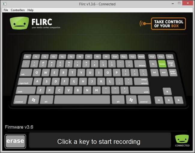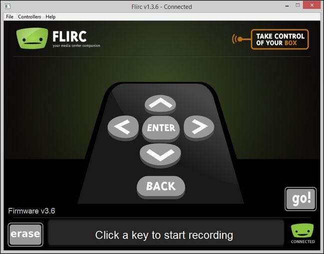 Installieren Sie die Software und schließen Sie vor dem Ausführen Ihren Flirc-Dongle an, damit Ihr Betriebssystem ihn als neues USB-Gerät erkennen kann. Sobald der Dongle von Ihrem System erkannt wurde, führen Sie die Flirc-Anwendung aus. Sie befinden sich auf dem Hauptbildschirm mit einer generischen Fernbedienung mit der Meldung "Klicken Sie auf eine Taste, um die Aufnahme zu starten" und einem "Los!" Taste.