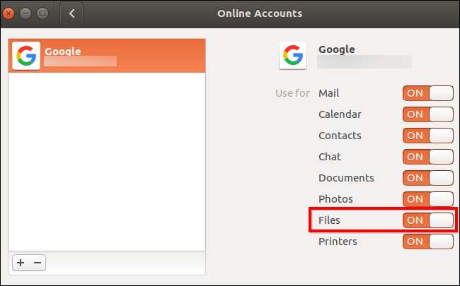 Klicken Sie auf die Schaltfläche "Konto hinzufügen", wählen Sie "Google" und melden Sie sich bei Ihrem Google-Konto an. Gewähren Sie dem GNOME-Desktop Zugriff auf Ihr Konto, wenn Sie dazu aufgefordert werden. Stellen Sie sicher, dass die Option "Dateien" hier aktiviert ist.