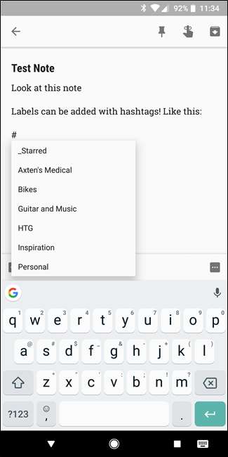 Um Ihren Notizen Beschriftungen hinzuzufügen, können Sie auf die Menüschaltfläche der Notiz tippen und dann die Option „Beschriftung hinzufügen“ auswählen. Sie können auch einfach einen Hashtag direkt in die Notiz eingeben, um das Beschriftungsmenü zu öffnen. Kinderleicht.