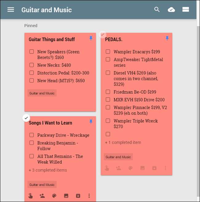 Da Sie mit Keep die Farbe von Notizen ändern können, ist dies eine hervorragende Möglichkeit, die Organisation zu gewährleisten. Sie können beispielsweise alle Ihre arbeitsbezogenen Notizen blau, die lebensmittelbezogenen Listen grün und die hobbybezogenen Notizen rot anzeigen. Wenn Sie also schnell etwas finden müssen, das mit der Arbeit zu tun hat, können Sie durch die blauen Noten scrollen und schnell einen Blick darauf werfen. Es ist einfach.