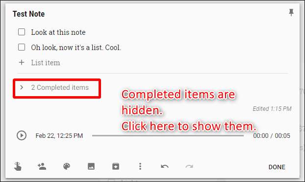 Ab diesem Zeitpunkt aktivieren Sie einfach diese Kontrollkästchen, wenn Sie die Elemente fertiggestellt haben, um sie an den unteren Rand der Liste zu verschieben. Sie können sie auch ausblenden oder anzeigen, indem Sie auf den kleinen Pfeil klicken / tippen.