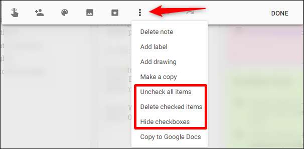 Wenn Sie zu irgendeinem Zeitpunkt die Kontrollkästchen entfernen, alle Elemente deaktivieren oder die aktivierten Elemente löschen möchten, können Sie dies tun, indem Sie auf dem Handy auf die drei Punkte neben dem Listennamen tippen oder im Web auf die Menüschaltfläche klicken. Von dort aus werden alle verfügbaren Listenoptionen angezeigt.