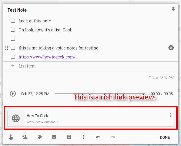 Schließlich können Sie die Freigabe sowie die Rich-Link-Vorschau aktivieren oder deaktivieren. Letzteres fügt im Grunde genommen allen Links, die Sie zu Keep hinzufügen, ein Vorschau-Snippet und ein Miniaturbild hinzu, was viel Platz beanspruchen kann.