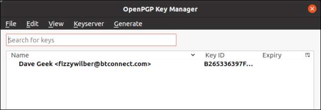Nachdem Ihre Tasten generiert wurden, erscheint ein Eintrag im Dialogfeld "OpenPGP Key Manager".