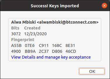 Einige Informationen zum importierten öffentlichen Schlüssel werden dann angezeigt. Sie werden sehen, wer den Schlüssel besitzt, die damit verbundene E-Mail-Adresse, die Anzahl der Bits, die die Verschlüsselung verwendet, verwendet, und wenn der öffentliche Schlüssel erstellt wurde.