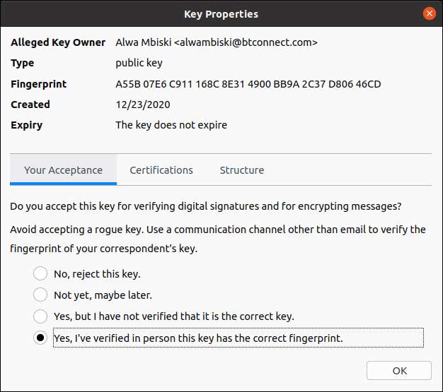 Wenn Sie sich mit dem Taste positiv von seinem Besitzer kamen, wählen Sie das Optionsfeld neben "Ja, ich habe in Person verifiziert. Dieser Schlüssel hat den richtigen Fingerabdruck, und klicken Sie dann auf" OK ".
