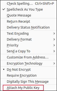 Das ist halb der Schlacht! Wir haben jetzt den öffentlichen Schlüssel von Alwas, also schicken wir ihm unsere. Starten Sie dazu einfach eine neue E-Mail an die Person, an die Sie Ihren Schlüssel senden möchten, oder antworten Sie auf eine ihrer E-Mails. Klicken Sie in der E-Mail-Menüleiste auf Options & GT; Befestigen Sie meinen öffentlichen Schlüssel.