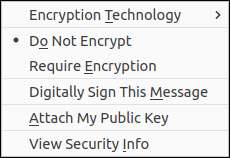 Die Optionen für die Verschlüsselung und die digitale Signatur von E-Mails sind im Abschnitt "Sicherheit" der E-Mail-Menüleiste verfügbar. Sie können Ihren öffentlichen Schlüssel auch in diesem Menü anhängen.