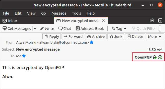 ALWA kann Ihnen jetzt antworten und Verschlüsselung verwenden. Wenn Sie eine verschlüsselte, per E-Mail erhalten, müssen Sie nicht etwas Besonderes tun, um es zu lesen - öffnen Sie es einfach wie üblich. "OpenPGP" im E-Mail-Header enthält grüne Heckmarks, um zu überprüfen, ob OpenPGP die E-Mail entschlüsselt hat und dass auch die digitale Signatur überprüft wurde.