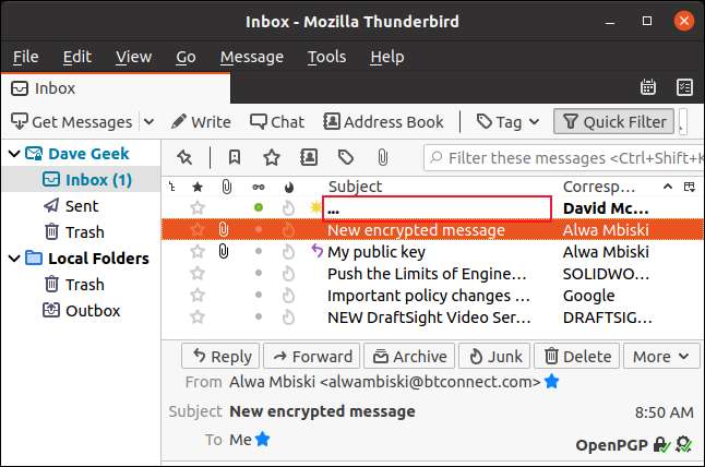 Die Betreffzeile einer verschlüsselten E-Mail wird als Ellipsen (...) angezeigt, bis Sie sie öffnen. Dies verhindert, dass jemand das Thema von verschlüsselten E-Mails erstellt, die Sie erhalten.
