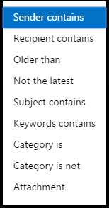 In diesem Beispiel wählen wir zwei der neun Bedingungen aus, die die E-Mail erfüllen muss, sowie zwei der acht Aktionen.