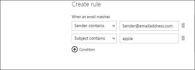 Wir klicken zuerst auf den Link Bedingungen, um eine zweite Bedingung hinzuzufügen. Angenommen, E-Mails von "[email protected]" mit dem Wort "apple" in der Betreffzeile sollten an einen Ordner mit dem Namen "Apple Emails" gesendet und als "WICHTIG !!!"