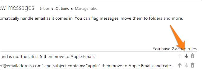 Es ist wichtig zu beachten, dass Outlook.com die von Ihnen definierten Regeln automatisch auswählt und basierend auf der Reihenfolge implementiert, in der sie in Ihrer Regelliste angezeigt werden. Aus diesem Grund ist es wichtig, Ihre Regeln in der Reihenfolge ihrer Wichtigkeit zu organisieren. Klicken Sie einfach auf die Aufwärts- und Abwärtspfeile neben den Regeln, um sie nach Bedarf zu ordnen.