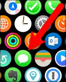 Wir werden zeigen, wie Sie Scribble in der Nachrichten-App verwenden. Sie können es jedoch auch in E-Mail-Apps und anderen Apps verwenden, in denen Sie Text eingeben. Drücken Sie auf die digitale Krone, um auf den App-Bildschirm zuzugreifen, und tippen Sie anschließend auf das App-Symbol Nachrichten.