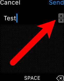 Zum Beispiel haben wir "Test" geschrieben und dann auf die Schaltfläche getippt. Die prädiktive Textliste wird angezeigt und wir drehen die digitale Krone, um durch die Liste zu scrollen, bis wir das Wort finden, das wir verwenden möchten. Sobald Sie aufhören, die digitale Krone zu drehen, wird das Wort, auf das der grüne Pfeil zeigt, automatisch ausgewählt und für Sie eingegeben.