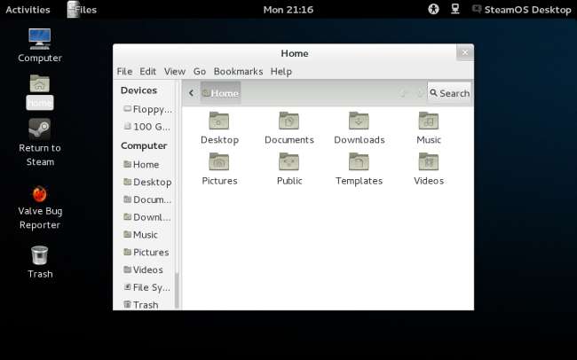Die Symbole "Computer", "Home" und "Papierkorb" öffnen einen Dateimanager an verschiedenen Stellen auf Ihrem SteamOS-System. Die Home-Verknüpfung öffnet Ihren Home-Ordner. Auf einem Linux-System In Ihrem Home-Ordner werden alle Ihre benutzerspezifischen Dateien und Einstellungen gespeichert . Dies entspricht einem C: \ Users \ NAME-Ordner unter Windows. Das Computersymbol zeigt Ihnen alle angeschlossenen Laufwerke an. Hier werden beispielsweise USB-Flash-Laufwerke angezeigt, die Sie anschließen.