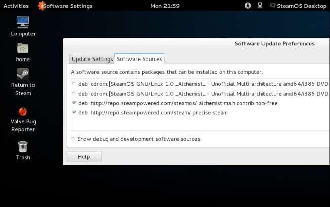 Langfristig plant Valve, eine größere Auswahl an Paketen für die Installation aus eigenen Repositorys bereitzustellen. Diese werden zur einfachen Installation in der Anwendung Software hinzufügen / entfernen angezeigt. Mitglieder der SteamOS-Community werden wahrscheinlich auch ihre eigenen Software-Repositorys erstellen, die Sie über Softwarequellen hinzufügen können, um eine einfache Installation und Updates für eine Vielzahl von Linux-Desktop-Software zu vereinfachen.