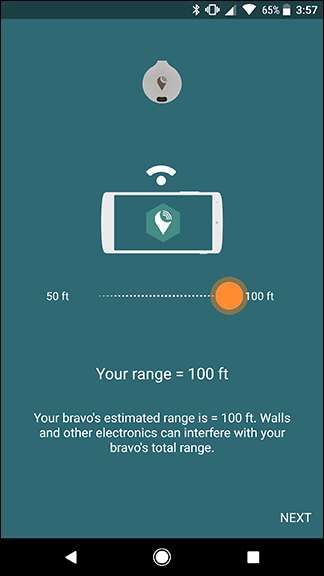 Nachdem Ihr Gerät angeschlossen ist, führt Trackr einige Tests durch, um sicherzustellen, dass Ihr Gerät funktioniert. Zunächst wird der Bereich getestet. Halten Sie dazu Ihren Trackr ein paar Meter von Ihrem Telefon entfernt und tippen Sie auf Test Range. Nach einem Moment zeigt Ihnen die App an, wie weit Sie entfernt sein können, bevor der Trackr die Verbindung trennt. Dies wird durch Wände und Elektronik beeinflusst, sodass Sie möglicherweise nicht über das Haus gehen und in Verbindung bleiben können. Es sollte jedoch funktionieren, wenn Sie relativ nahe sind.