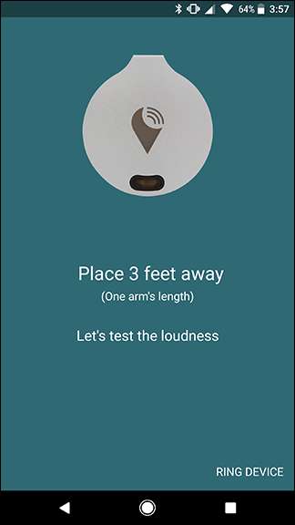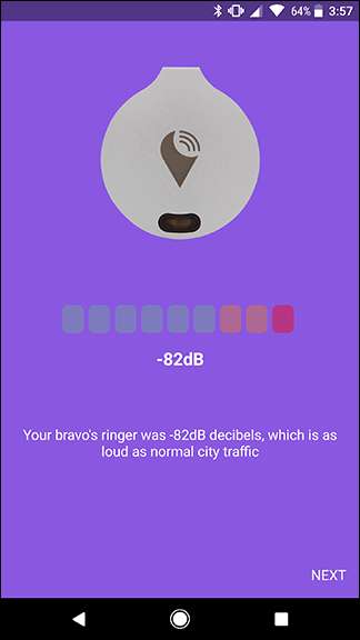 Als nächstes testet die App, wie laut Ihr Trackr ist. Stellen Sie den Trackr ein paar Meter von Ihrem Telefon entfernt auf und tippen Sie auf Klingelgerät. Ihr Trackr gibt einen Klingelton aus. So laut klingelt Ihr Gerät, wenn Sie versuchen, es von Ihrem Telefon aus zu finden. Wenn es richtig funktioniert, gibt Ihnen die App eine Anzeige der Dezibelstufe.