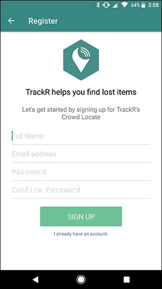 Schließlich werden Sie von Trackr aufgefordert, sich bei Ihrem Trackr-Konto anzumelden (oder ein Konto zu erstellen). Dadurch wird Ihr Trackr an Ihr Konto gebunden, sodass Sie ihn von anderen Geräten aus finden können. Darüber hinaus werden Sie mit dem Trackr Crowd Locate-Dienst verbunden, mit dem andere Benutzer Ihre Geräte finden können, wenn Sie sich nicht in Reichweite befinden. Außerdem kann Ihr Telefon alle Trackrs erkennen, die jemand anderes verloren hat.