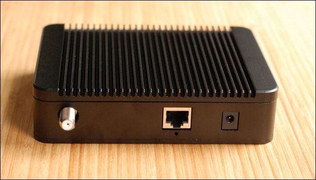 Werfen wir einen Blick auf die Rückseite des HomeRun, um uns mit dem sehr einfachen Layout vertraut zu machen. Auf der Rückseite des Geräts befinden sich eine Koaxialbuchse (an der Sie das von der Antenne kommende Koaxialkabel anschließen), eine Ethernet-Buchse (an der Sie das Gerät an Ihr Heimnetzwerk anschließen) mit einer Netzwerkanzeigelampe und eine Netzbuchse für das Netzteil alle unten von links nach rechts zu sehen.