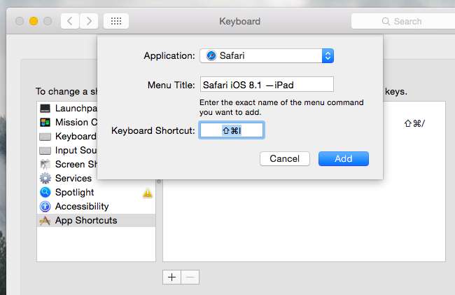 Mit Safari können Sie dem Benutzeragenten-Umschalter auch eine Tastenkombination zuweisen. Um dies einzurichten, öffnen Sie das Fenster Systemeinstellungen, wählen Sie Tastatur und dann Verknüpfungen. Klicken Sie unter App-Verknüpfungen auf die Schaltfläche +, um eine neue Verknüpfung hinzuzufügen, wählen Sie die Safari-Anwendung aus und geben Sie den genauen Titel der Menüoption ein, die Sie verwenden möchten, wie sie derzeit in Safari gekennzeichnet ist. Als dieser Artikel geschrieben wurde, lautete dies „Safari iOS 8.1 - iPad ”. Geben Sie eine Tastenkombination ein, und Sie sind fertig.