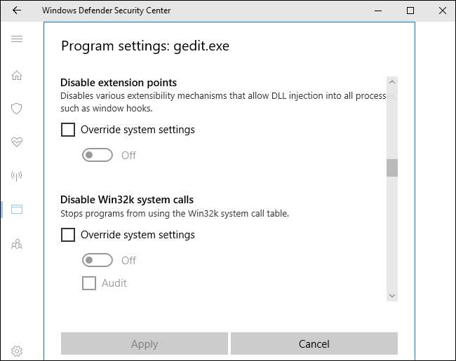 Nach dem Hinzufügen finden Sie eine lange Liste von Einstellungen, die für die meisten Benutzer nicht von Bedeutung sind. Die vollständige Liste der hier verfügbaren Einstellungen lautet: Arbitrary Code Guard (ACG), Blockieren von Bildern mit geringer Integrität, Blockieren von Remote-Images, Blockieren von nicht vertrauenswürdigen Schriftarten, Code Integrity Guard, Kontrollflussschutz (CFG), Verhinderung der Datenausführung (DEP), Deaktivieren von Erweiterungspunkten , Win32k-Systemaufrufe deaktivieren, Untergeordnete Prozesse nicht zulassen, Adressfilterung (EAF) exportieren, Randomisierung für Bilder erzwingen (obligatorische ASLR), Adressfilterung importieren (IAF), Speicherzuordnungen randomisieren (Bottom-up-ASLR), Ausführung simulieren (SimExec) , Validieren des API-Aufrufs (CallerCheck), Validieren von Ausnahmeketten (SEHOP), Validieren der Handle-Verwendung, Validieren der Heap-Integrität, Validieren der Image-Abhängigkeitsintegrität und Validieren der Stack-Integrität (StackPivot).