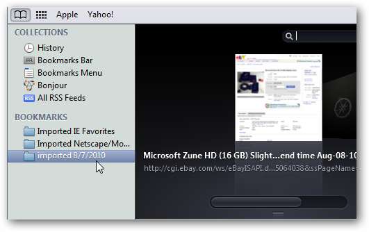 Die Seitenleiste Alle Lesezeichen anzeigen wird geöffnet und zeigt den soeben importierten Lesezeichenordner sowie die Bildvorschau an.