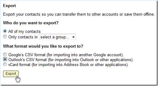 Wählen Sie nun das CSV-Format (Comma Separated Values), damit wir die Kontaktliste in Thunderbird importieren und auf die Schaltfläche Exportieren klicken können.