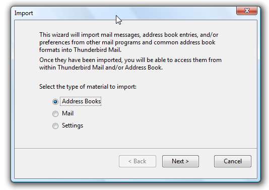 Der nächste Schritt ist das Importieren dieser Datei in Thunderbird. Öffnen Sie Thunderbird und gehen Sie zu Tools Import. Behalten Sie die Standardauswahl bei und klicken Sie auf Weiter.